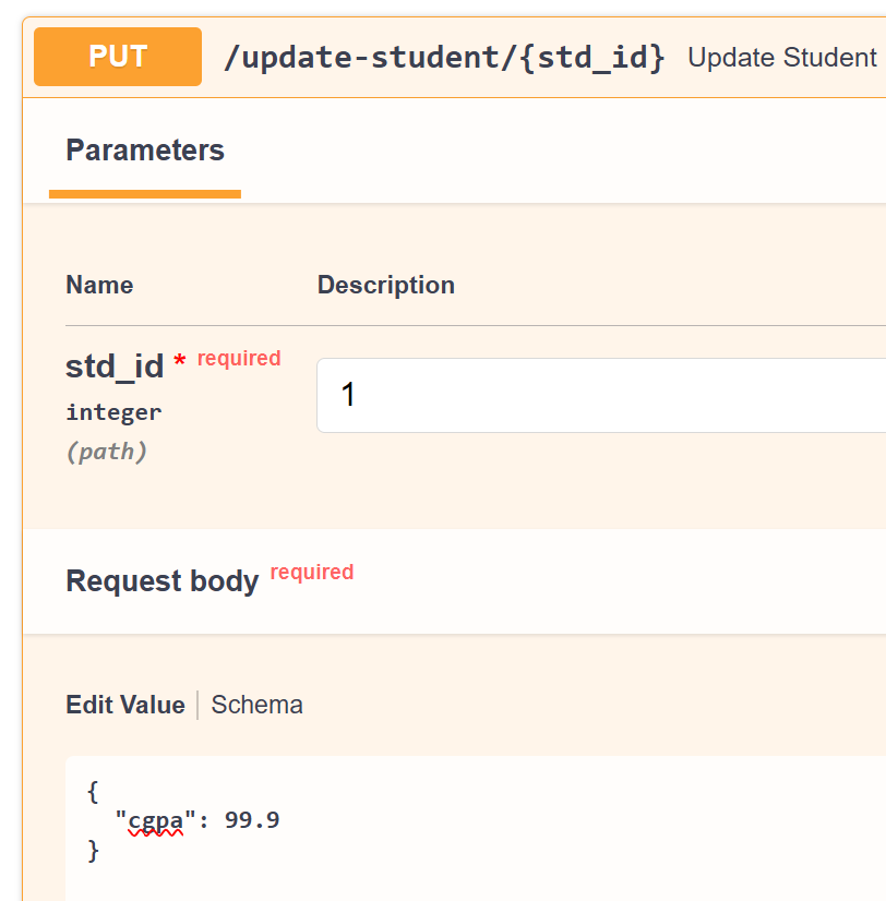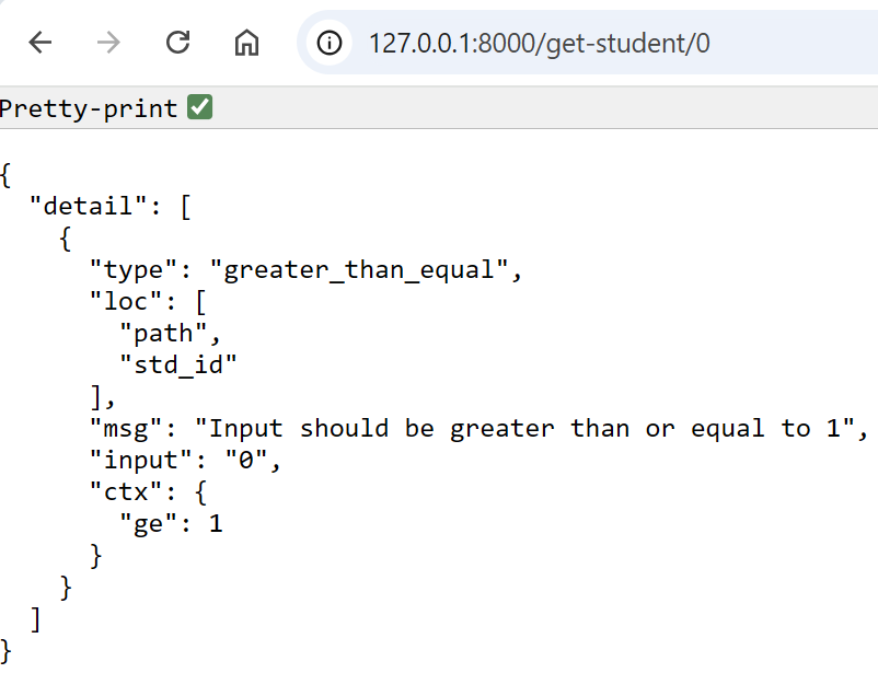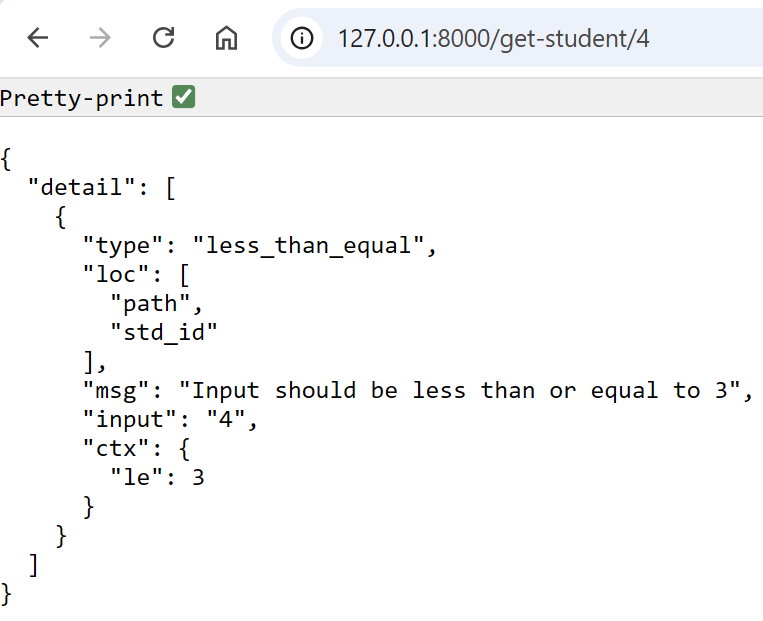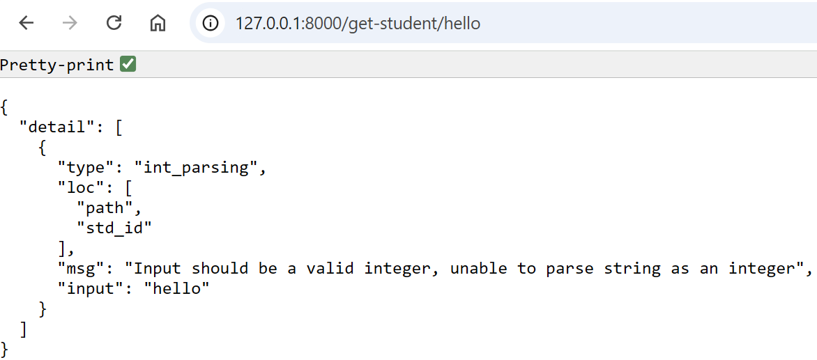 Moreover, FastAPI provides us auto validation if we provide type hints, because we specified std_int:int if a non integer value was passed we get this structured response (i.e. we do not need to hard code the type checking):