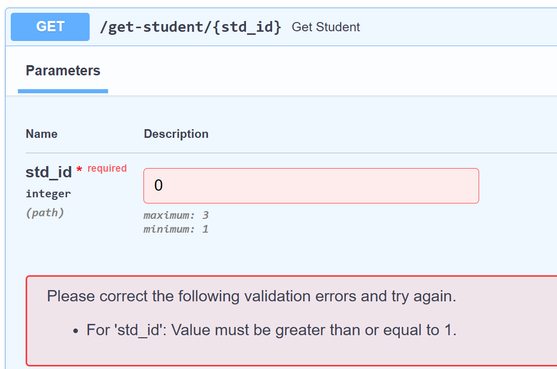 Autovalidation is about more than just types, Using the Path from fastapi and Annotated from typing package we can constraint the parameter as we want and FastAPI takes care of validation. For example, consider we have total of three students with ids 1,2,3 then we can constraint that the input must be greater than or equal to 1 and less than or equal, otherwise we will get structured response about the violation of those constraints: