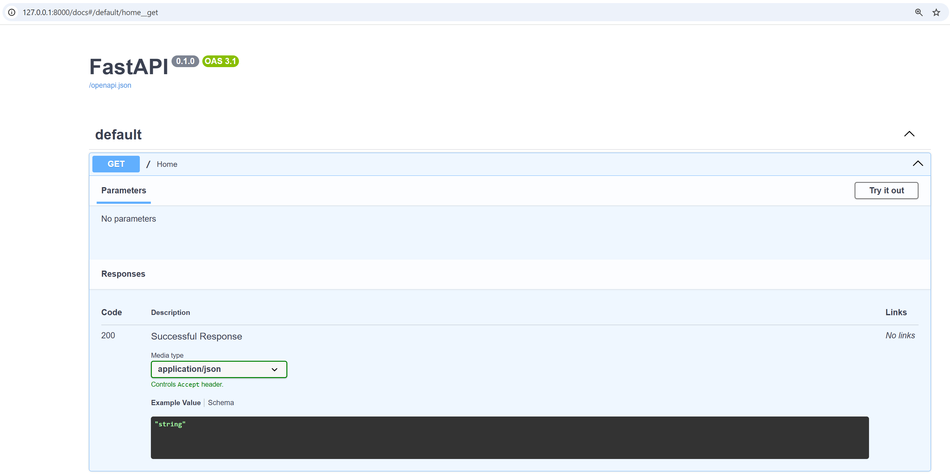 If you attach /docs to the url, you will see the auto documentation of your service (endpoints) provided to you from FastAPI. There you can try out the different endpoints you developed. For now, we will only see our home endpoint: